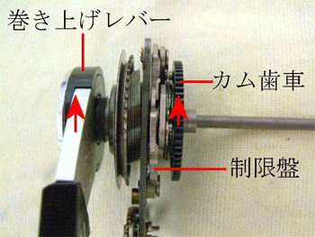 巻き上げるとカム爪がカム歯車に咬合し、次々に動力が伝わりフィルムを送ったり、シャッターをセットします。