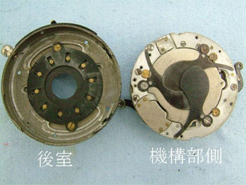 モード板が秒時モード(赤丸部)の時は、セットレバーが赤点線方向に動かすことでメインスプリングが巻ける。