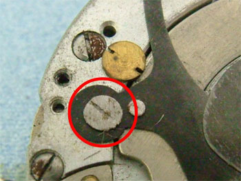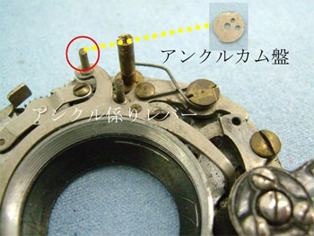 アンクル係りレバーのピン(赤丸部)は、アンクルカム盤の形状からアンクルの掛かり量を制御する。
