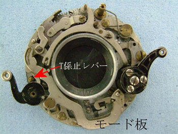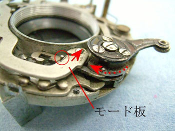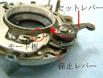 T&Bモードにするとモード板は赤矢印方向に動き、セットレバーの動きを邪魔しますのでセットすることが出来ない。