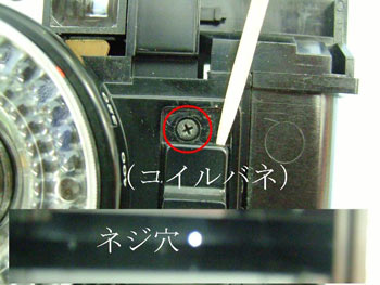 フロントカバーに取り付けてあるストロボSWの裏側にコイルバネがある。