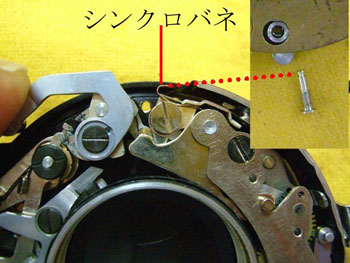 前後のシャッターを止めている4本のネジの内、一本は貫通ネジであり、先端にシンクロバネが掛かっている。組み立ての際、シンクロバネの掛け忘れには注意しよう。