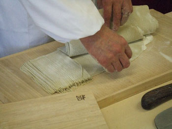 この際には、包丁に付いた蕎麦粉を削ぎ落とします。