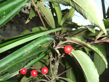 正月の飾りに使われる藪柑子が赤い実を付けていました。植えた覚えがありませんで、小鳥が運んで来たものと思います。