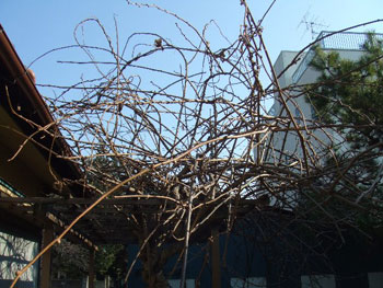 キウィーの枝が篠山紀信状態です。どうしても雄株は元気がよいのでこの様な状態になってしまいます。収拾がつきませんし、結実を良くするために剪定を致します。