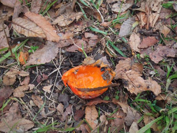 上手に食べまして、皮だけが地上に落ちています。人間社会だけでは無く、鳥の世界にも要領の良いのがおりまして、樹上より足場の良い落ちた皮を啄む姿が見られます。