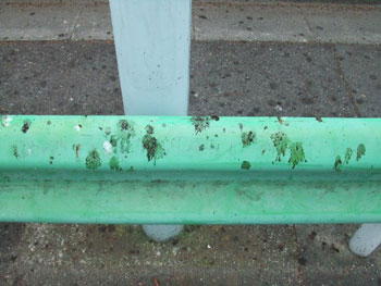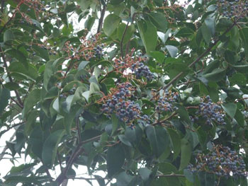 ところが、この実を食べますと憤慨(糞害)することになります。電線に止まり快便の結果がご覧の通りです。実の色素が糞の色を染めるのです。