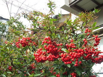 冬の庭の彩りのピラカンサもご馳走とばかりに食べ始めました。半分ほど食べられています。