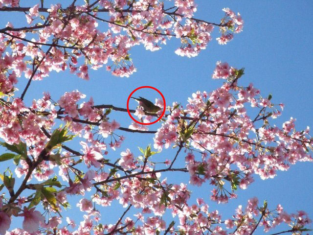 満開になりました河津桜です。待ちかねたように花の蜜を吸いに小鳥(赤丸部)がやって来ました。蜜蜂は未だのようです。
