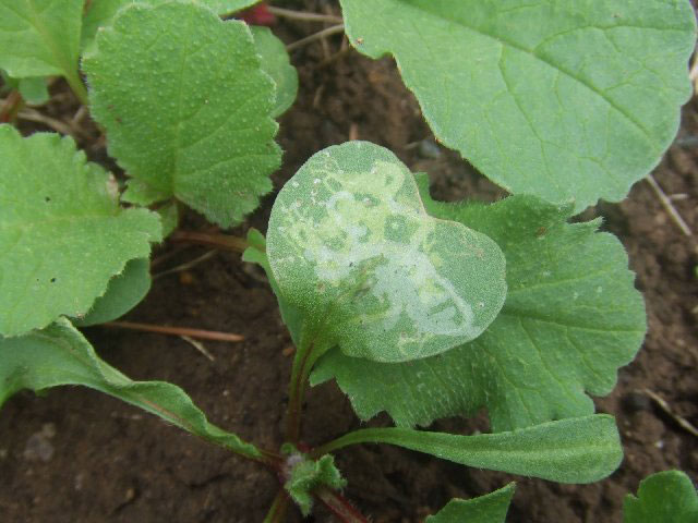 子葉にハモグリバエの食害が見られます。子葉ですから羽化しないよう取り去ってしまいました。