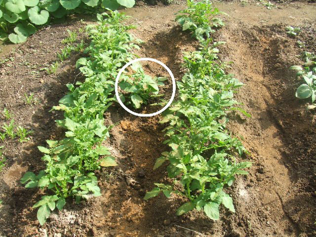 所が、畝の途中にアンデスレッドが一株、芽を出しております。