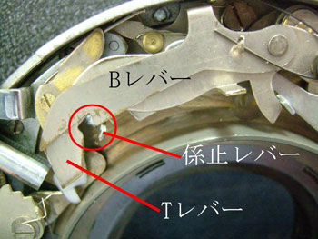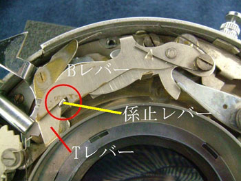 人為的にB(バルブ)の位置を作りました。シャッターをセットしてレリーズしている間だけ開いています。係止レバーはシャッター開閉を邪魔する役目をします。