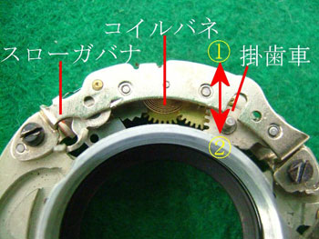 スローガバナにはゼンマイ仕掛け(コイルバネ)?がありまして、無闇な位置で外しますと掛け歯車がゼンマイ(コイルバネ)の作用により飛び出して仕舞います。