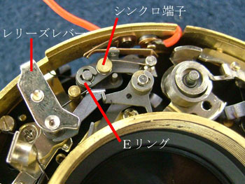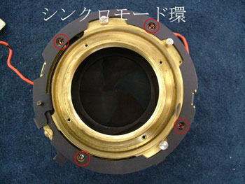 シンクロモード環を所定の位置にすると、シンクロモード環の穴(赤丸部)にシャッター機構部を止めているネジが窓から顔を出す。