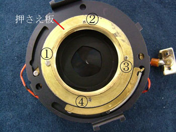1のネジは」ヘリコイドに固定される形状をしている。即ち錨の役目であるから取り付け時の位置に注意が必要である。押さえ板を他の3本のネジで外す。
