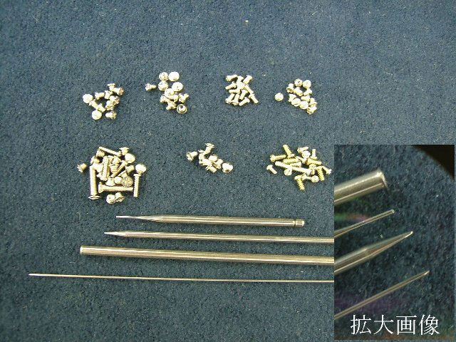 小ネジ1.7mm径をGET。パイプをGET。拡大画像の一番下のパイプは0.5mm径です。注油の際に使います。