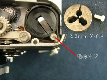 初期型のオリンパスOM-1は電池接片を絶縁体のプラスティクネジで固定しています。