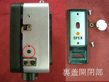 さてと、初挑戦ですから、何処から分解しましょうかね??取り敢えず外せそうな部品を外していきます。裏蓋開閉部を外してみました。赤丸に前カバーを止めているネジが在りました。外しましょうね。