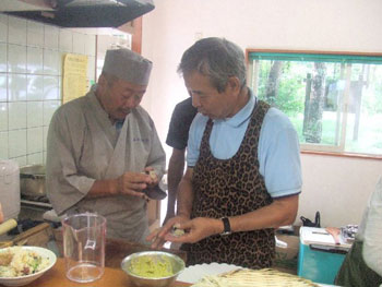 其処は船頭が多うございまして、巻物に挑戦する船頭がおります。傍で見ていましても大丈夫かと思う並べ方ですね!ご飯なら均しようがありますが、蕎麦は言うことを聞いてはくれません。すかさず、店主の奥様が「ダメ・ダメ、一本一本並べなくては」と指導が入ります。