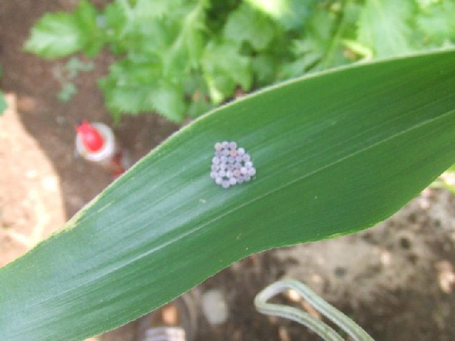 トウモロコシの葉裏に怪しき卵が産み付けられていました。予想するに害虫の卵だよね!