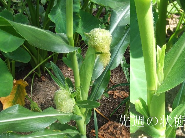 左側にレイヤーした画像が先週16日の状態でした。僅か一週間で髭を生やし実が肥大していました。ヤングコーンは無理なようです。週一農業は難しい物です。
