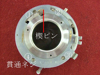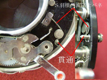 前群レンズが外れなければ、本当に万事休すである。と言うのもシャッター前後を止めているネジの一つが貫通ネジで、S羽根逆流防止バネの掛かりになっているからです。
