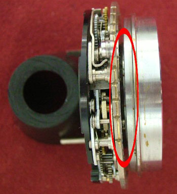 シャッター羽根を取り去ると前群レンズを取り付ける線条(赤丸部)が見える。