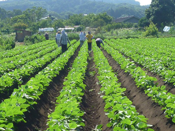 開耕機で1回目の土寄せをした後に鍬で株間に土を被せていきます。株間に土を掛けるのは倒壊防止と発根を即す他に株間に芽生えた雑草の除草の役割があります。