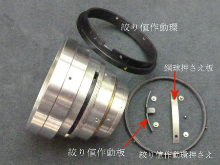 鋼球押さえ板と鋼球・絞り値作動板を取り去ります。
