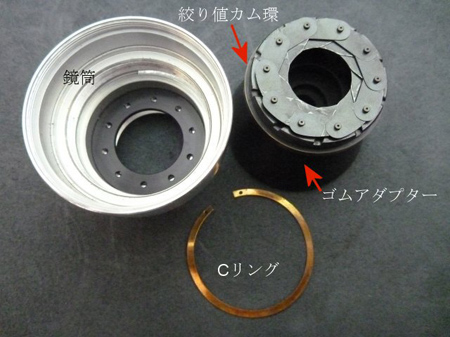 ゴムアダプターを絞り値カム環迄差し込み、鏡筒毎反転させて絞り値カム環上に絞り羽根を乗せたまま分離します。