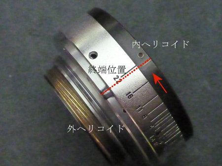 内ヘリコイドを赤矢印方向に回転させますと終端位置になりました。