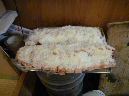 店の片隅にこれでもかの塩を置き脱水している生鮭がありました。塩で余分な水分を抜き旨みを凝縮します。脱水後、水洗いして天日干しをしますと大人気の塩鮭の完成です。