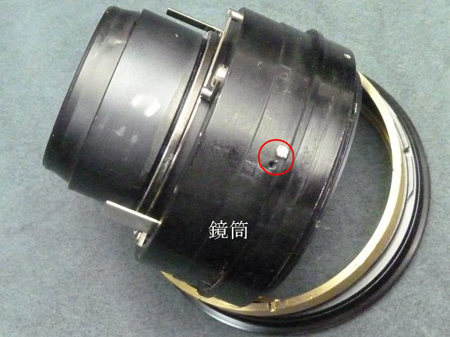 ヘリコイドから分離しました鏡筒を観察しますとヘリコイドへ組み込む際に鏡筒の位置をを決めるネジ(赤○部)がありました。