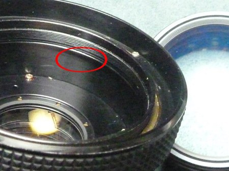 力では緩まなかった原因は、前群レンズ緩み防止の薬剤がヘリコイド部内壁(赤○部の黒く変色した部分)に湿潤していたのです。