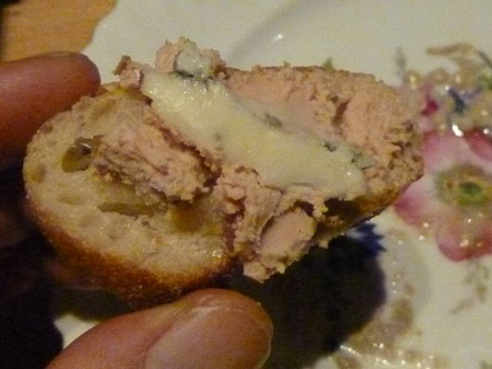 好き嫌い女王はフォアグラが好みです。持参したバケットにフォアグラペーストを塗り、好き嫌い大王持参のブルーチーズを加えますとワインが進みました。