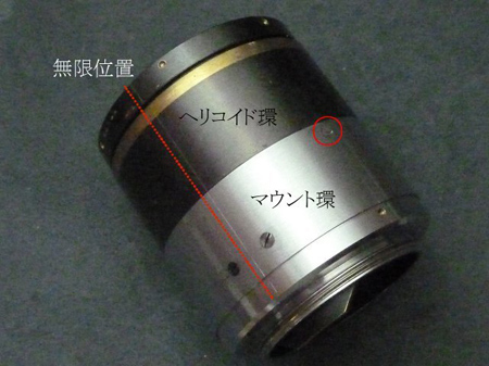 中ヘリコイドを時計方向(赤矢印)に回すと終端位置となり、製造時の卦書きが付けてありました。