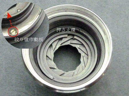 絞り値作動板を止めているネジを外し、鏡筒内側に押し出して外しますと絞り値環も外れました。