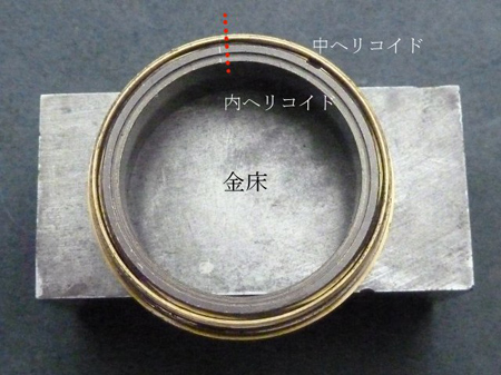 両者は前後どちらの方向にも抜けてしまうようで、組み込み位置の確認が出来ないのです。 其処で金床に乗せ、中・内ヘリコイドが水平になるように致しました。此の行為は何度か繰り返した方が、誤差が少ないですね! 両者に卦書きを入れておく事で組み込み位置がずれないようにしたのです。