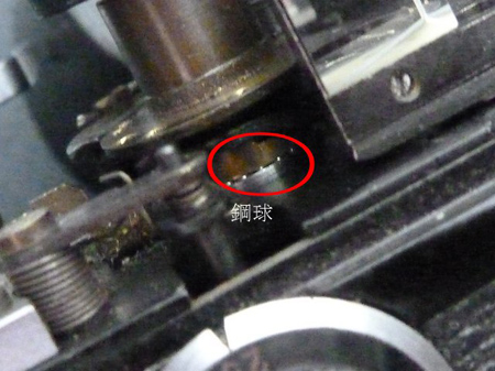 シャター速度機構部のドラム軸に鋼球(赤○部)を組み込んであり、言われている程粗悪な作りでは無いようです。