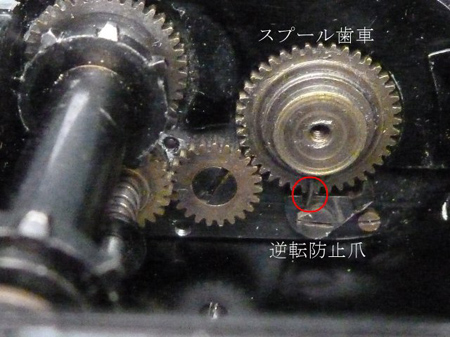 組み入れの際は、スプール歯車に取り付けられているバネを逆転防止爪への咬合忘れに気を付けます。