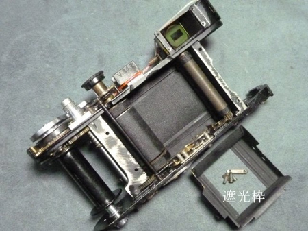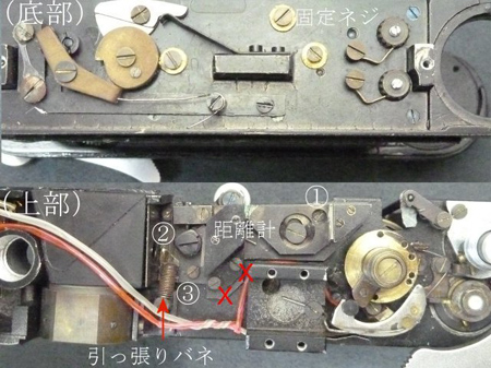 最後に残りましたのが遮光枠です。遮光枠を固定している底部からの固定ネジ障害無く外せますが、問題は距離計コロの奥に位置する固定板です。