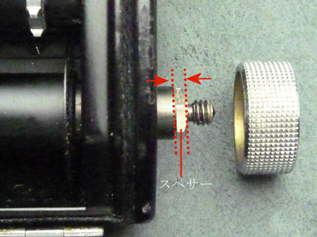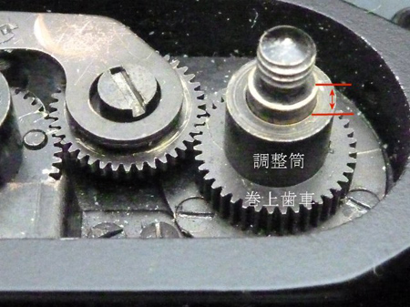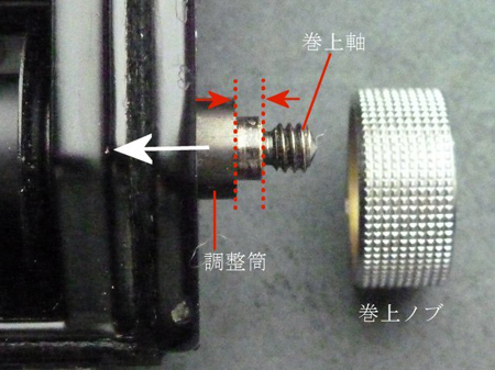 巻き上げの逆転防止機構が働かないのは、巻き上げ軸と巻き上げノブとの間(赤点線部)に隙間があるからです。