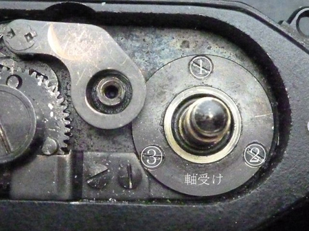 組み立て時、巻き上げ軸を回転させ、軸受け部の凹みにフリクションバネの突起が咬合しているのを確認してから枚数計他を取り付けます。