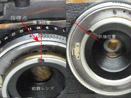 シャター側の指標点に合わせて前群レンズに無限位置の印を付けておきます。