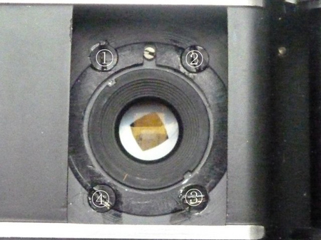 完成後曇硝子をレール面に当て、ルーペで焦点の確認をすれば済みますが、印を付けておくことで簡易に済ますことが出来ます。特にシャターを開放に出来ない個体には有効な考え方です。