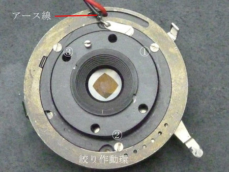 シンクロアース線と絞り作動環を止めている3本のネジを外します。