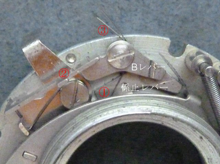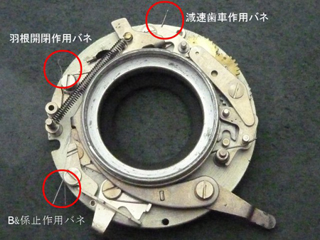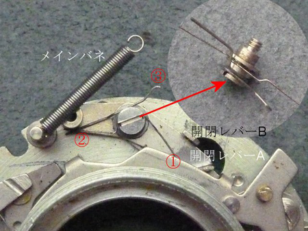 赤丸(1)にバネの一端が、赤丸(2)のBレバーに一端が位置し、飛び出ている両者のバネ(赤丸(3))はシャター後室の側壁に位置します。