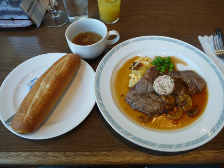 COREDO室町3F Bistro石川で昼食と致します。ランチメニュー(1,100円)に400円別途支払うとステーキが味わえるとありました。隠居人喜びます。
