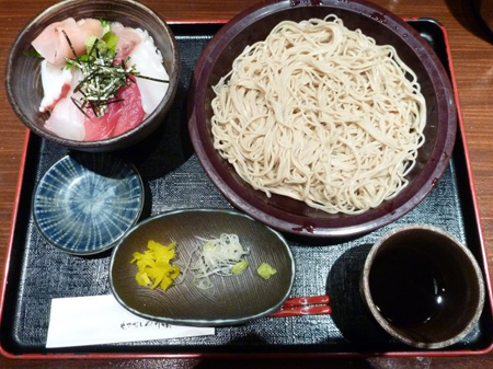 寒い季節でも暖房の効いた環境は冷蕎麦を時として欲する。ツルと咽頭を駆け下る冷たさが味しい。オマケに隠居人が好む海鮮の小丼付きです(780円)。