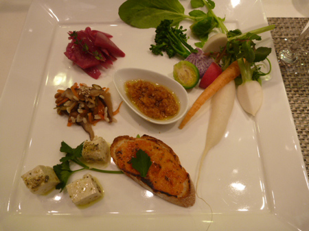 時計回りに皮付き野菜の味噌にゅかうだ(オリーブオイルと合わせた味噌を付けて頂きます)・酒粕のトースト・イタリアン豆腐旨塩麹マリネ・麹納豆・紫のピクルス。